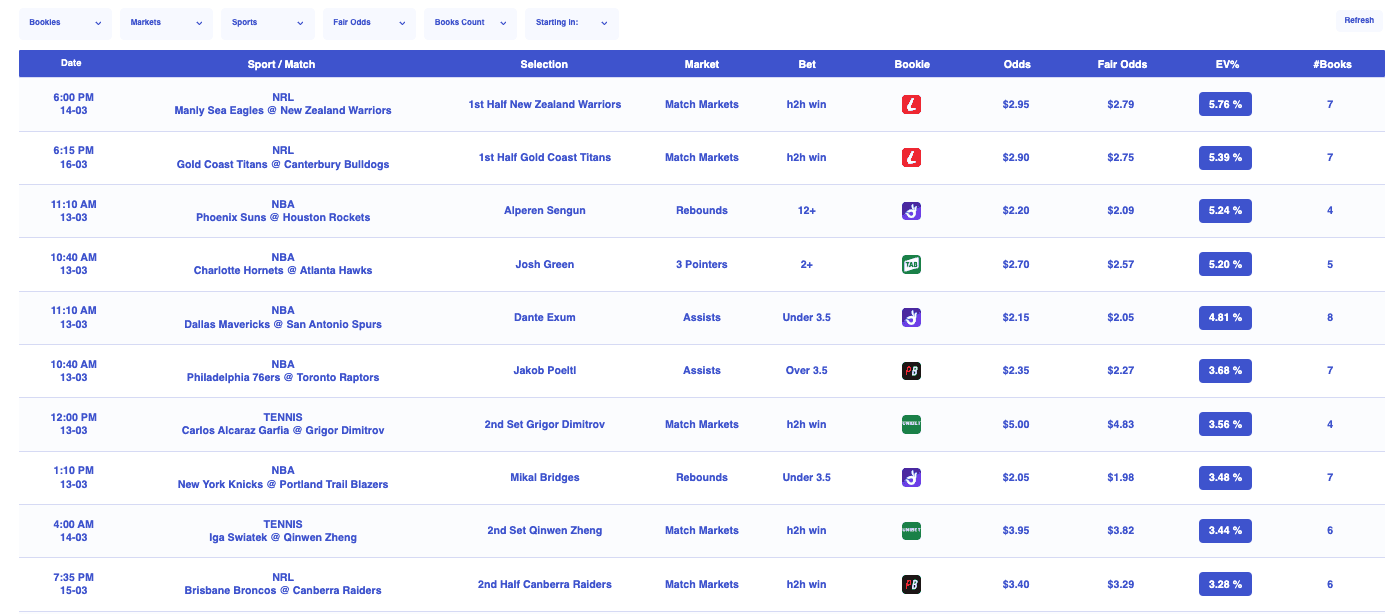 Australia ranks among the world’s largest betting markets, offering an unparalleled range of odds. This diversity creates numerous positive EV opportunities, especially in more niche markets where bookmakers may misprice events. Coupled with strong demand and fierce competition, Australia provides an ideal environment for implementing a positive EV betting strategy.
