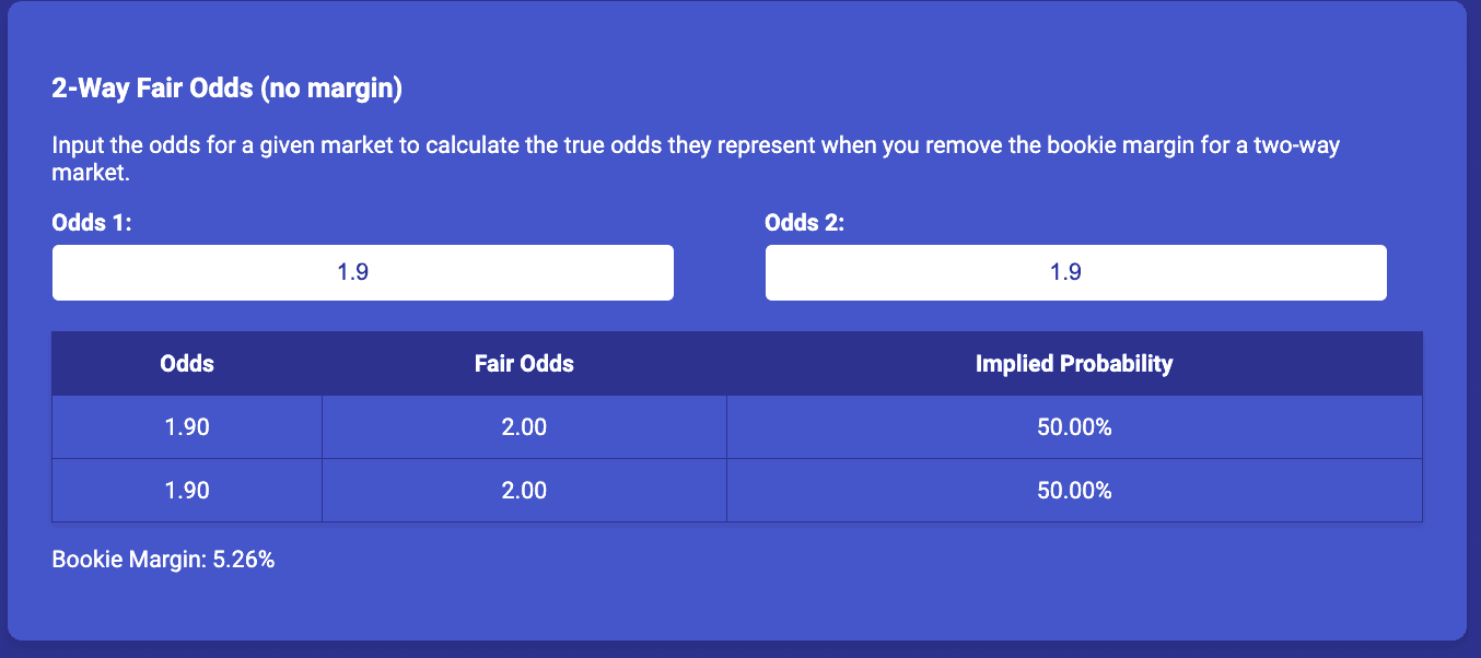 Or, you can just use our calculator. Simply put the two odds into our “Fair Odds 2-Way (no margin)” calculator.