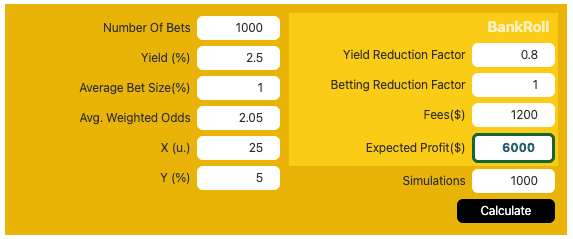 Let’s take a look at what this looks like for our 2.05 bet with a 2.5% edge over 1,000 bets. We are going to use this amazing calculator to input your positive EV betting strategy and explore various simulations, giving you a clear picture of how different scenarios might unfold.