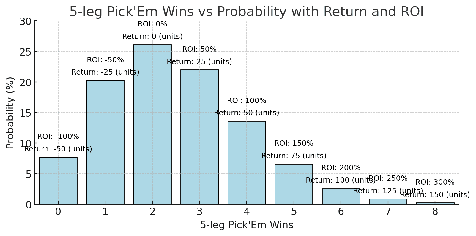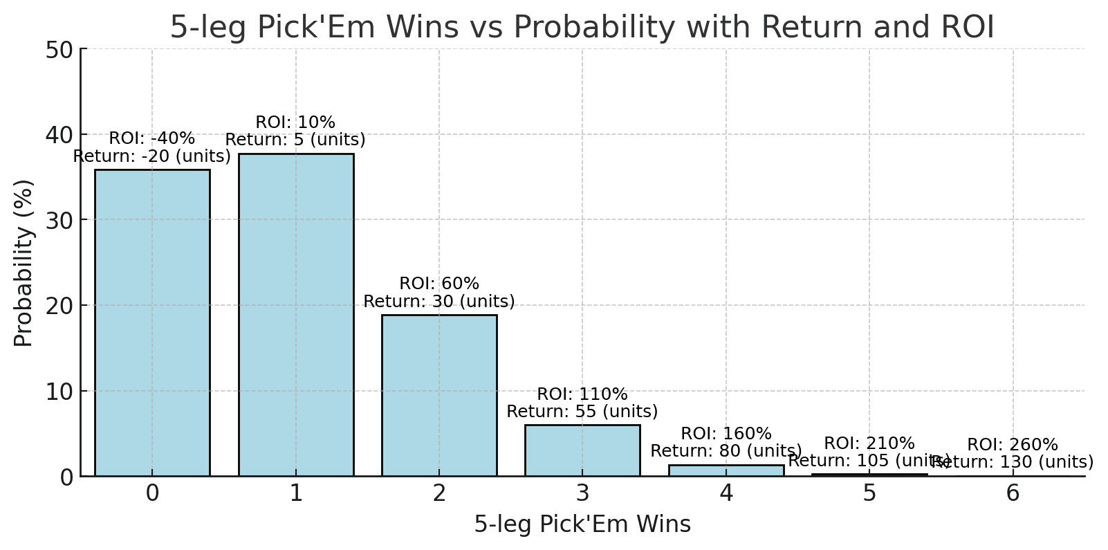 Let’s take a deeper look at the 5-leg Pick’Em and map out the probability distribution with the following conditions: