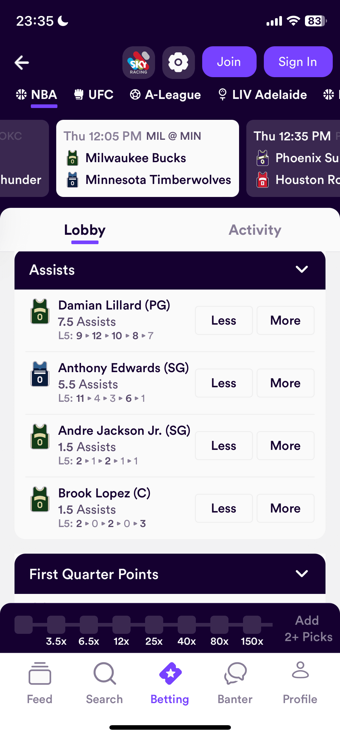 Note: the normal Dabble book may also be offering odds for Anthony Edwards assists (e.g. they are offering 1.78), but this price does not actually matter as we are only interested in the total market price.
