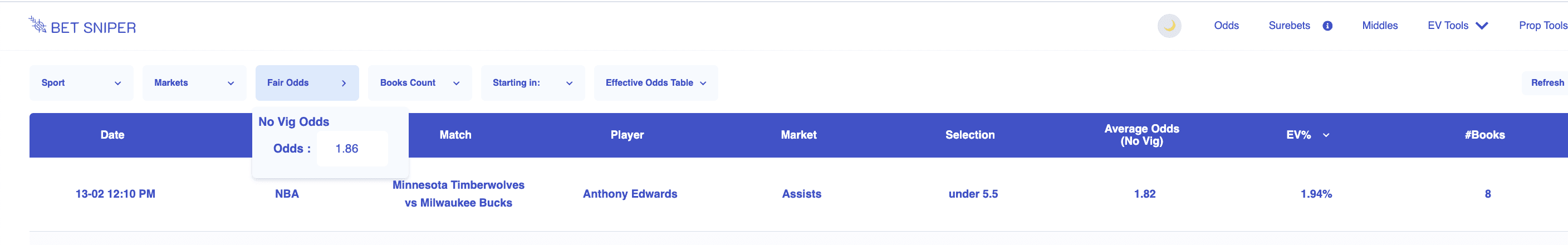 Right now we can see that under 5.5 assists for Edwards is heavily favoured and well below 1.867. However the prices above include the bookie edge. We need to remove that to understand if it will still be expected value positive.