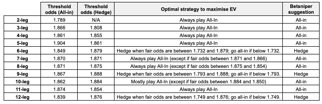 In the table below, we compare the threshold probability for hedge and all-in for every leg combination: