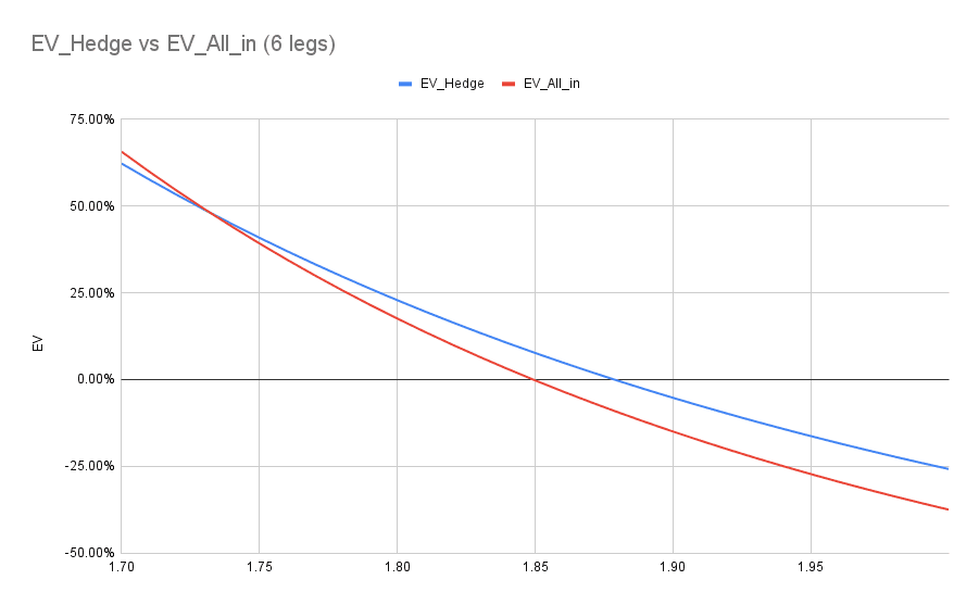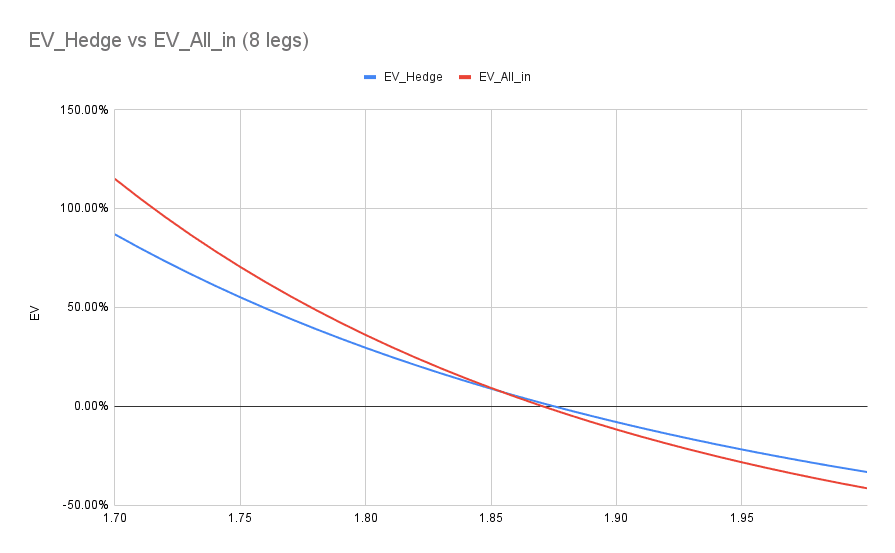 Although the threshold odds for the 8-leg Pick’Em is larger when hedged compared to All-in, you can see from the graph that the EV is almost always higher playing All-in. In fact, mathematically you would only play an 8-leg hedged when the average fair odds of ach leg in the Pick’Em is between 1.875 and 1.854. And even still, if you are playing this Pick’Em you would only be getting a few percent of EV, so it’s not worth it.