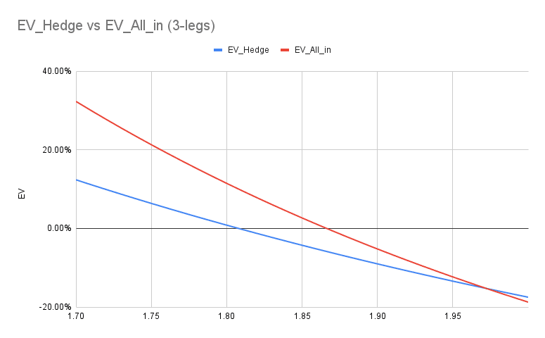 We can see the All-In curve crosses the x-axis at 1.866 and the Hedge curves at 1.808. It is quite clear that for all the times where EV is positive, you get more EV playing All-In.